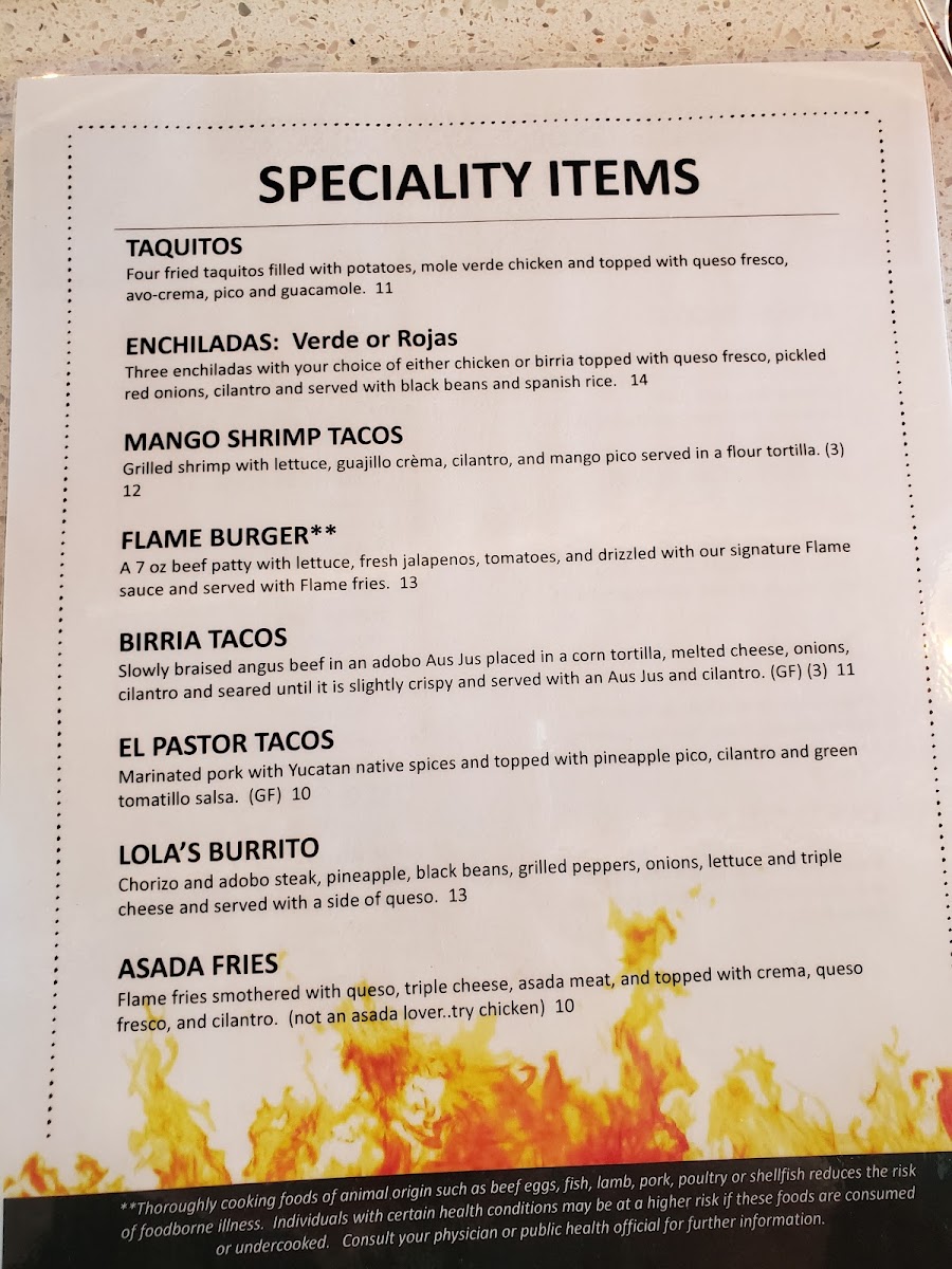 3) Flour tortillas filled with our homemade chorizo, asada, and grilled onions. Topped with cilantro, queso fresco and served with your choice of Flame salsa.