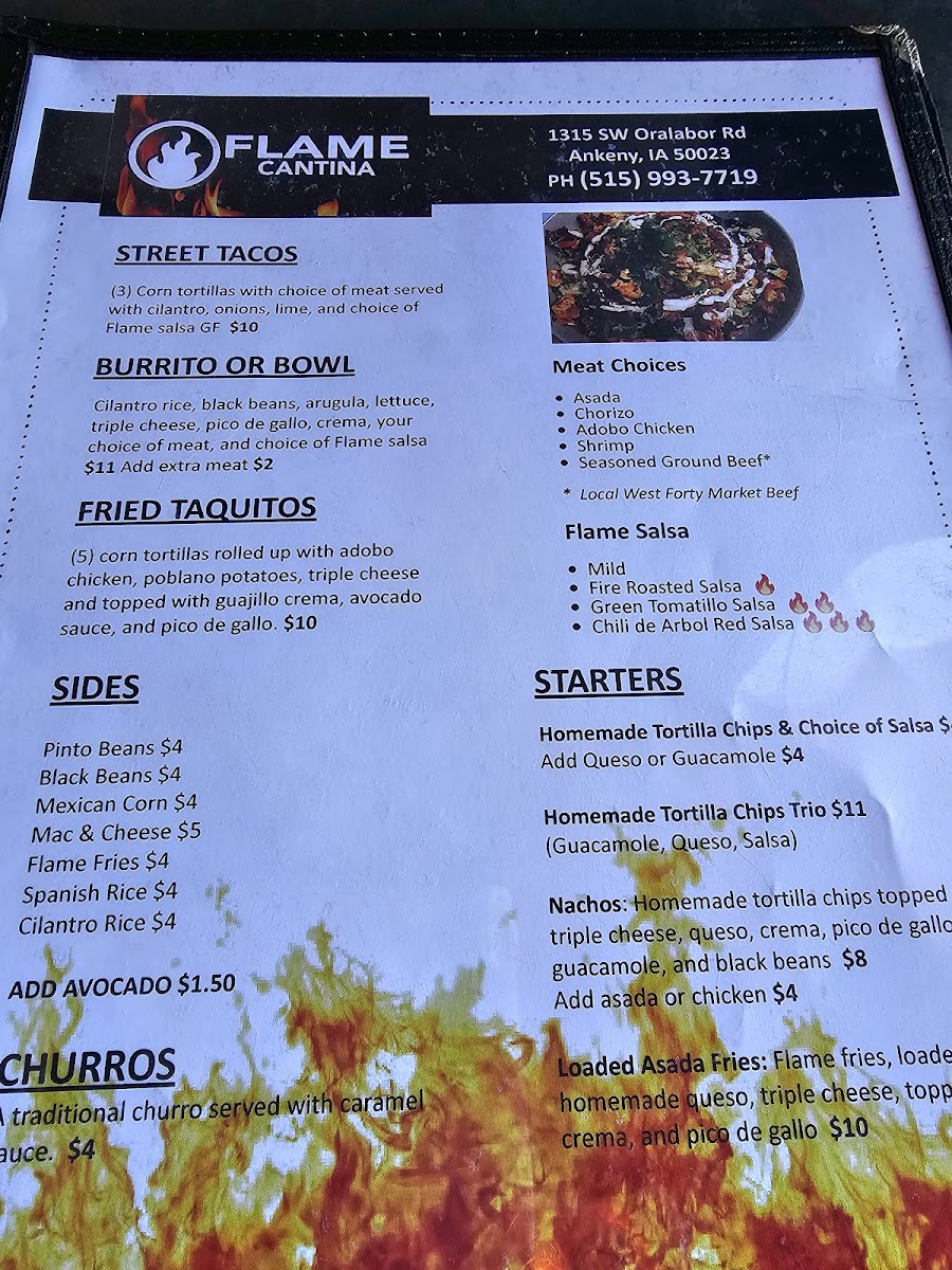 Welcome to Flame Cantina, a vibrant culinary gem nestled in Ankeny, Iowa. This restaurant specializes in mouthwatering Mexican dishes that promise to ignite your taste buds. The menu features a delightful array of tacos, enchiladas, and specialty items, showcasing fresh and flavorful ingredients.